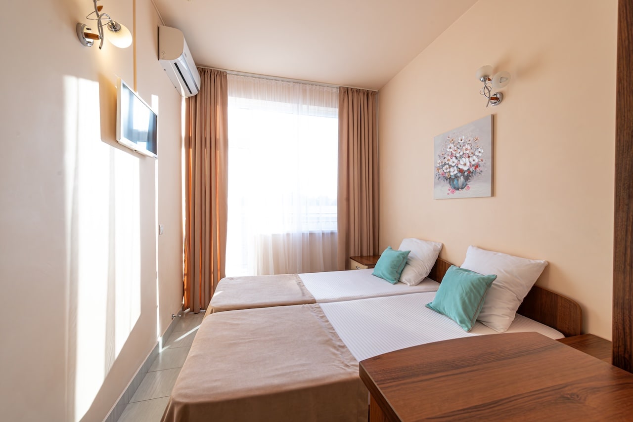 В номере 3 односпальных кровати или 2 двуспальных и 1 односпальная.